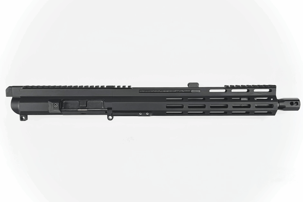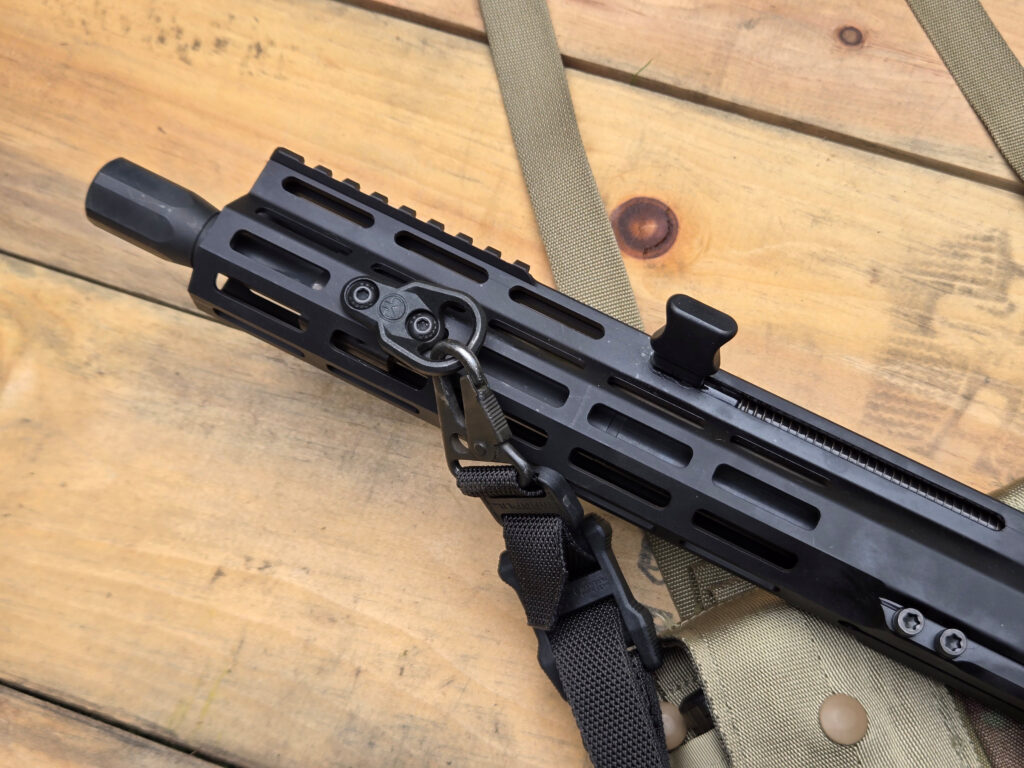 My 12.5 inch barrel has a 1:8 twist and is made from 41V50 match grade barrel that’s vacuum, stressed. It has a Melonite finish and a burnished chamber. The muzzle uses a common 1/2×28 thread and is fitted with a 4 port Micro Brake. Due to the bufferless design, the Mike-15 uses a proprietary bolt of 4342 vacuum treated steel with a Melonite finish. FM uses an 11.75 inch M-LOK handguard finished in a black Type III hard anodizing on the 12.5 inch barrel upper.