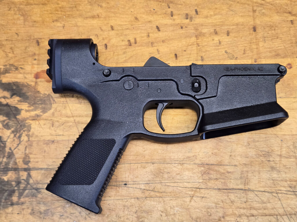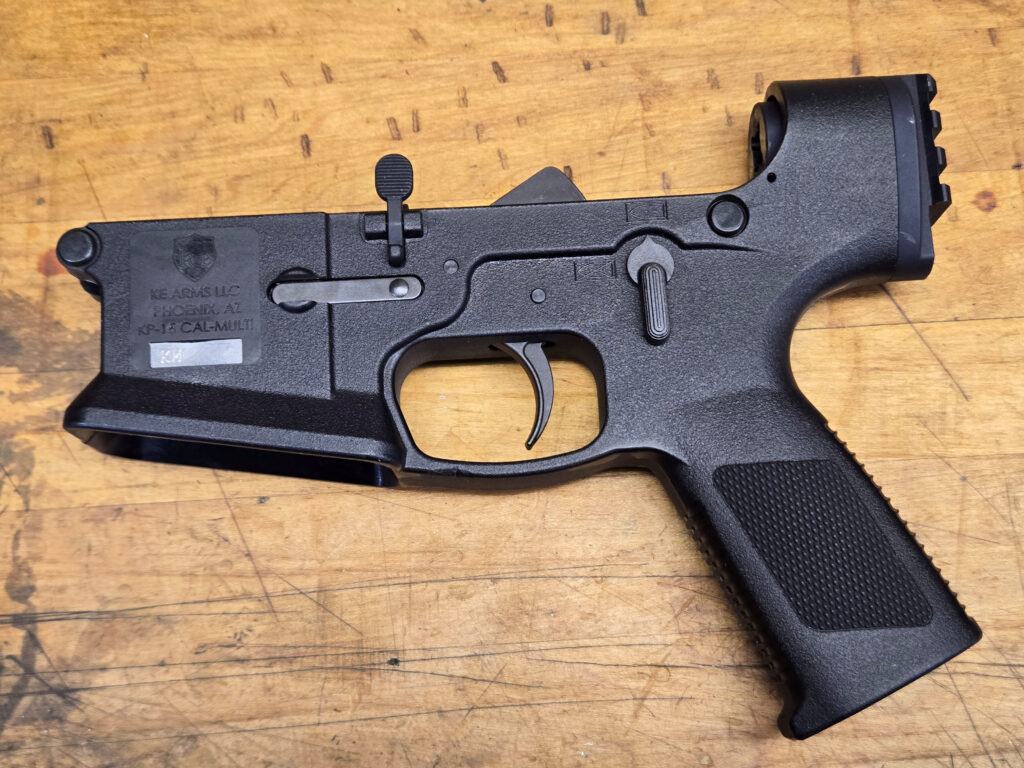 KE Arms makes a unique monolithic polymer lower for the AR15 platform. They’re one piece units that include the core receiver, the pistol grip and the fixed A1 length buttstock. The monolithic design provides the strength that typical polymer receivers don’t have and alleviates the common issue of cracking where the receiver extension (the buffer tube) screws in.