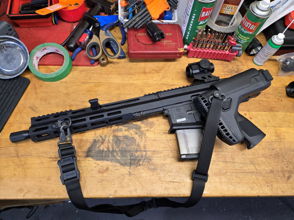 With the stock folded my FM/KP-15 is just under 23.5 inches in overall length. With the stock open and fully extended its 33.25 inches. You knock off 3 inches with the stock collapsed. Weight is 6.14 pounds with sling, optic and empty magazine. It isn’t the smallest SBR I’ve built, but it’s a good balance of compactness and practical size.