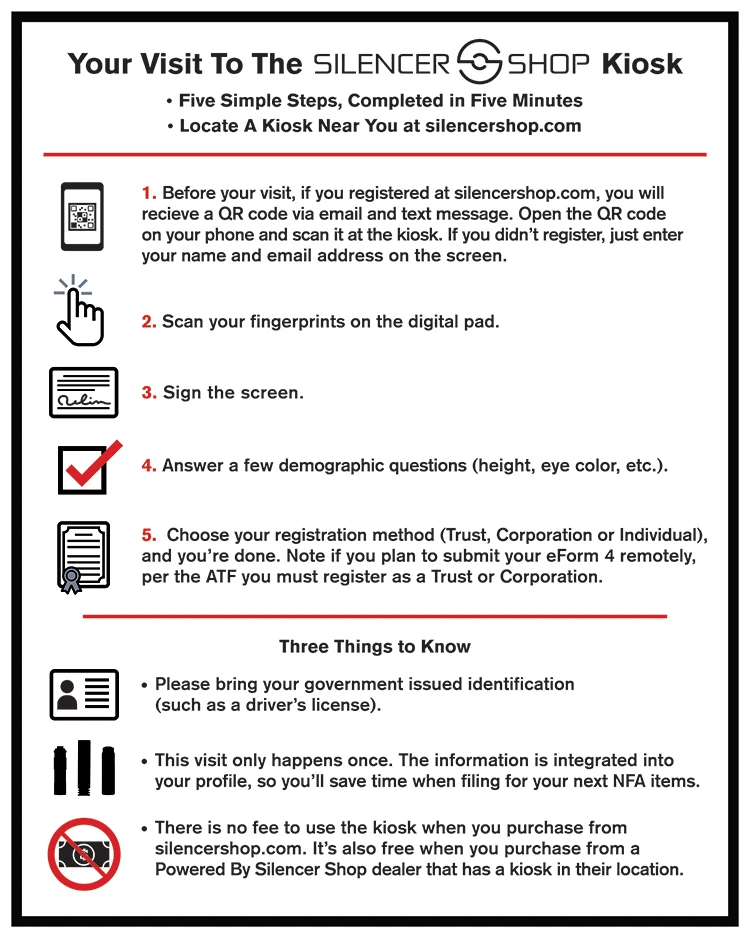 Fingerprints and photos are captured once in person at a local Silencer Shop dealer kiosk and stored securely for any future purchases, so you don’t have to repeat this part of the process if you decide to buy another suppressor, even an SBR or transferable machine gun down the road.