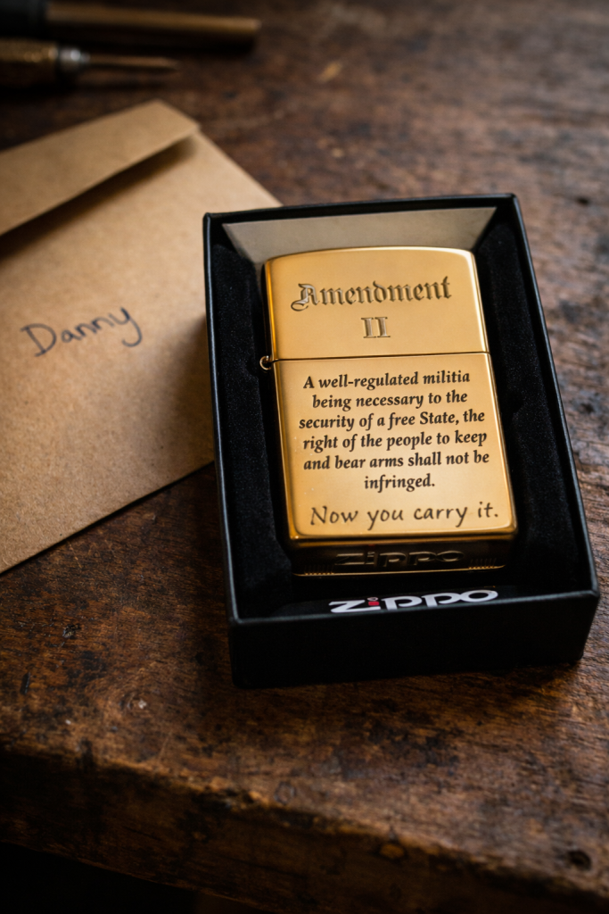 Danny stood in the empty shop for a long moment, reading the engraving in the last light through the front window. Then he opened it — that snap, loud in the quiet — and sparked the wheel.