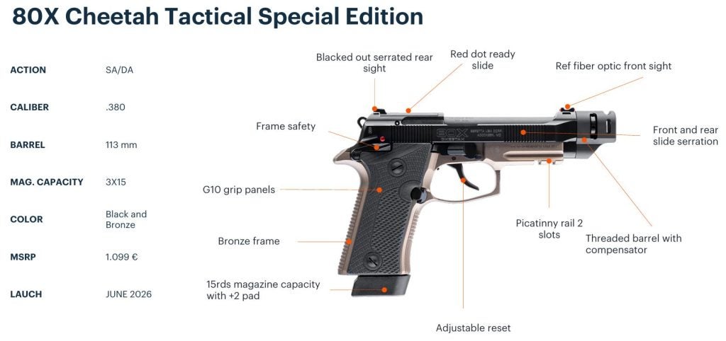 The official Beretta Product catalog for the new Cheetah notes that the Tactical Special Edition comes in a dual-tone look with a black slide, barrel, grips, and magazine base pad enriched with a bronze anodized frame. The MSRP is €1,099 (roughly ~$1,289 USD) with availability starting in June 2026. As Beretta gears up for its 500th anniversary celebrations throughout 2026, this special edition is one more sign the Cheetah revival is far from over.