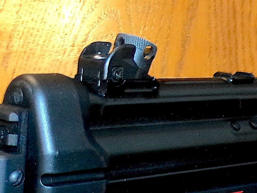 This is no bargain-bin cheapie. The gun, as I mentioned above, is made on actual H&K machinery and shares some features with the original. We have the classic wide handguard and rear sight, with its rotating “drum” and four apertures.