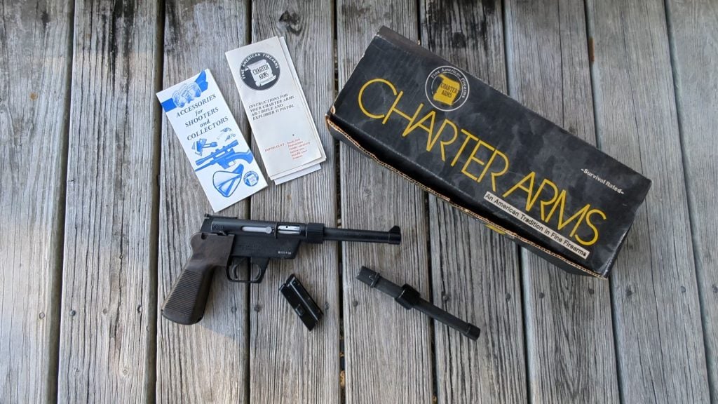 The simulated walnut grip allows you to hold a spare with an eight-round magazine. It drops in, and a heel release locks it into place. Charter Arms made a rare and expensive side-mounted scope mount. Ebay shows them for between $300 and $400.
