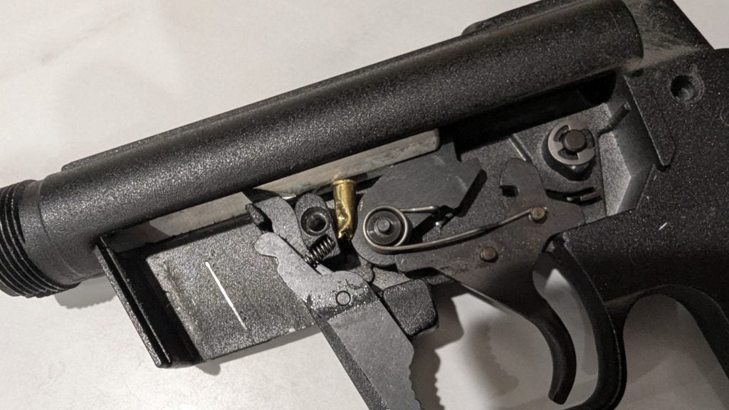 I hand-loaded a round at a time directly into the chamber, an action which made me wish I had three hands; I got more consistent accuracy. Enough to create a three-inch group at 15 yards on paper with eight rounds. Something’s going on, but I’m not enough of a gun plumber to say for sure.