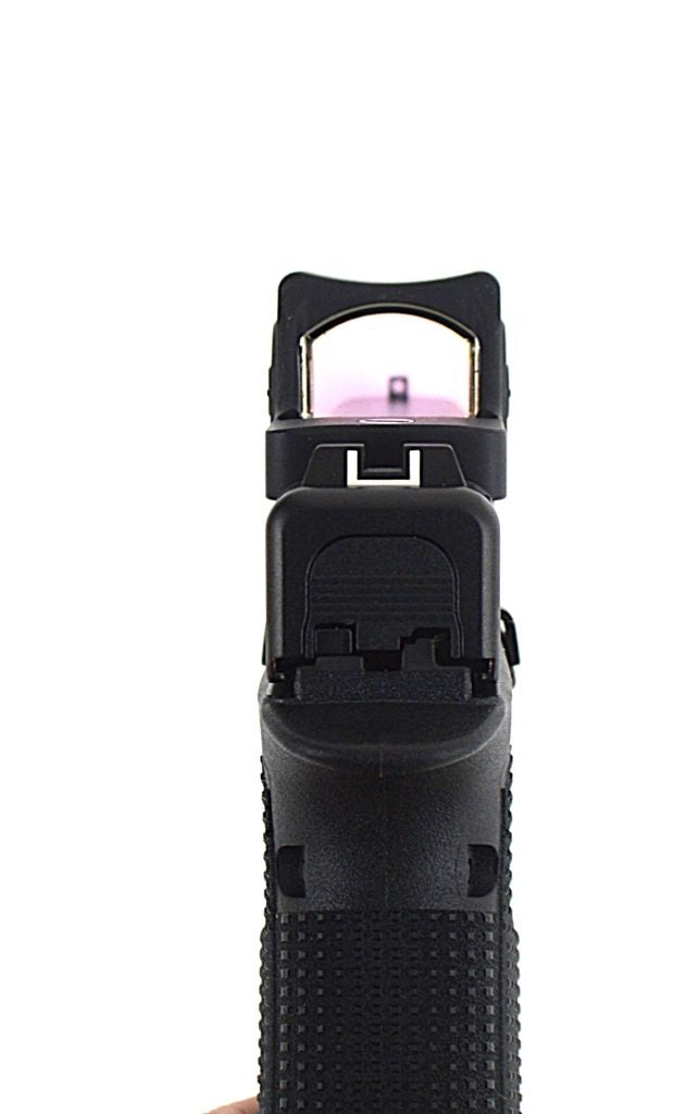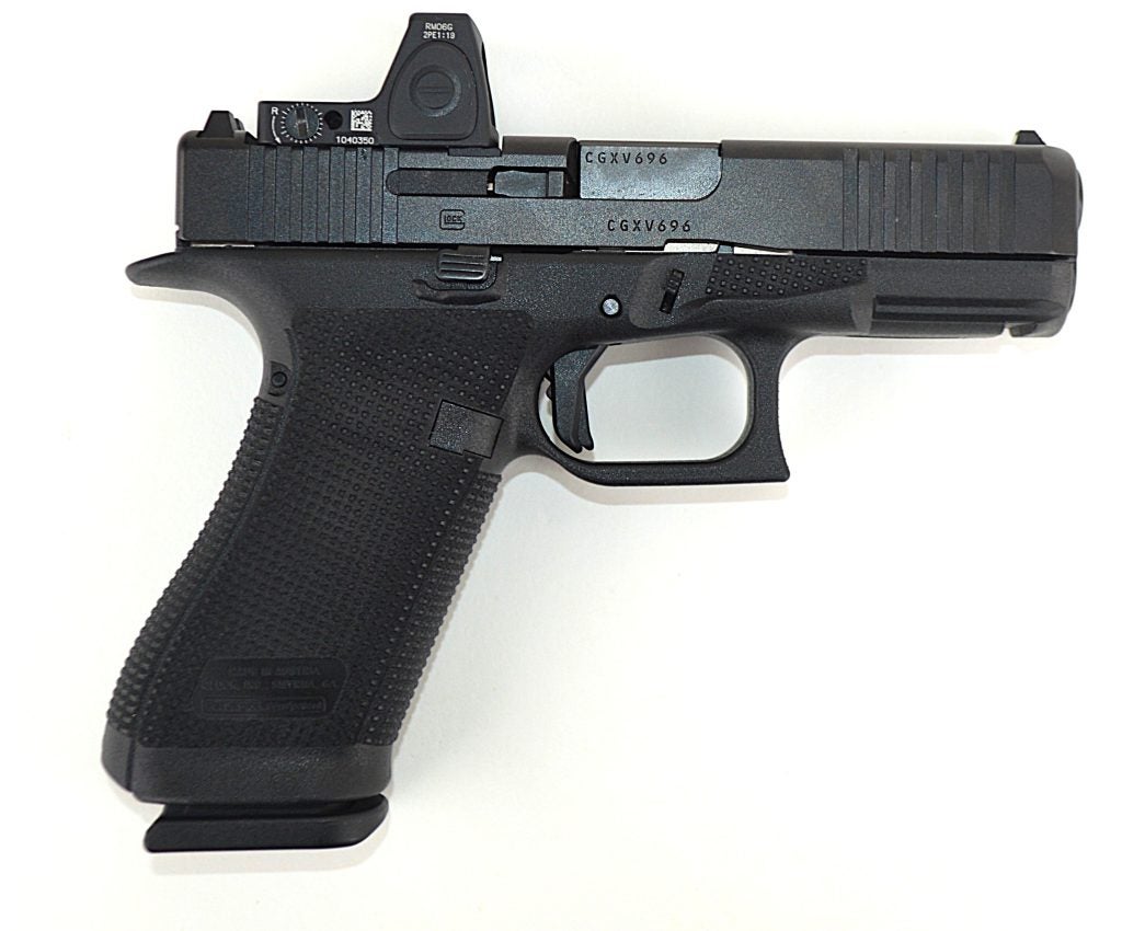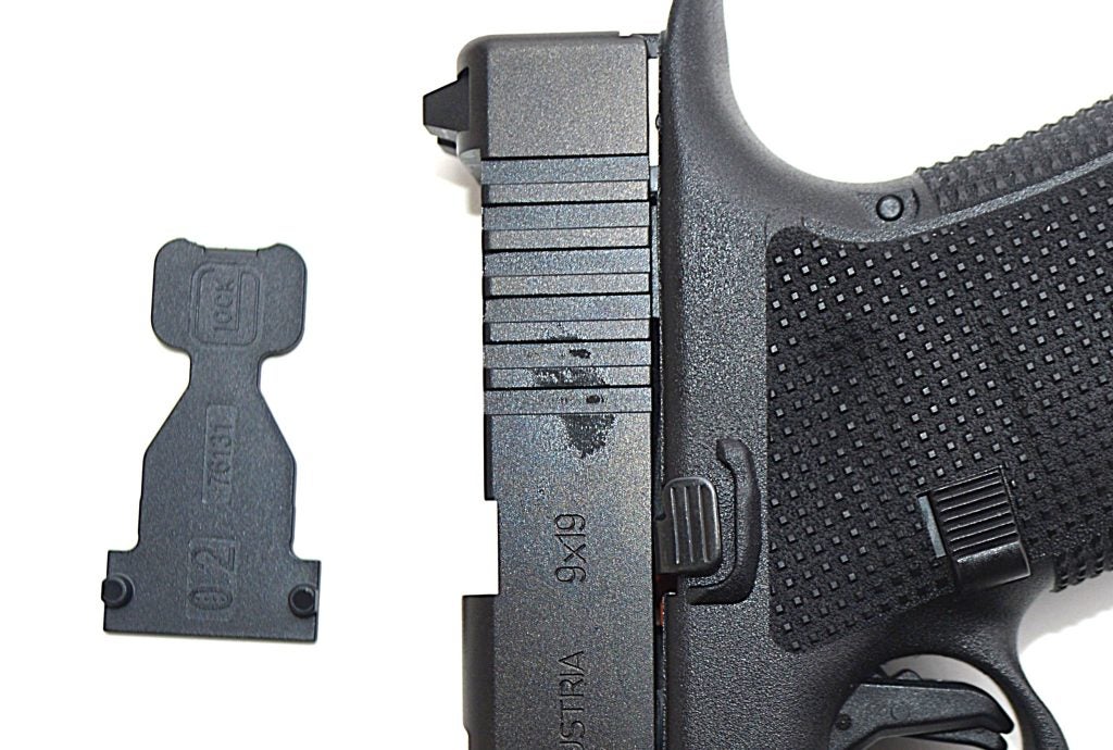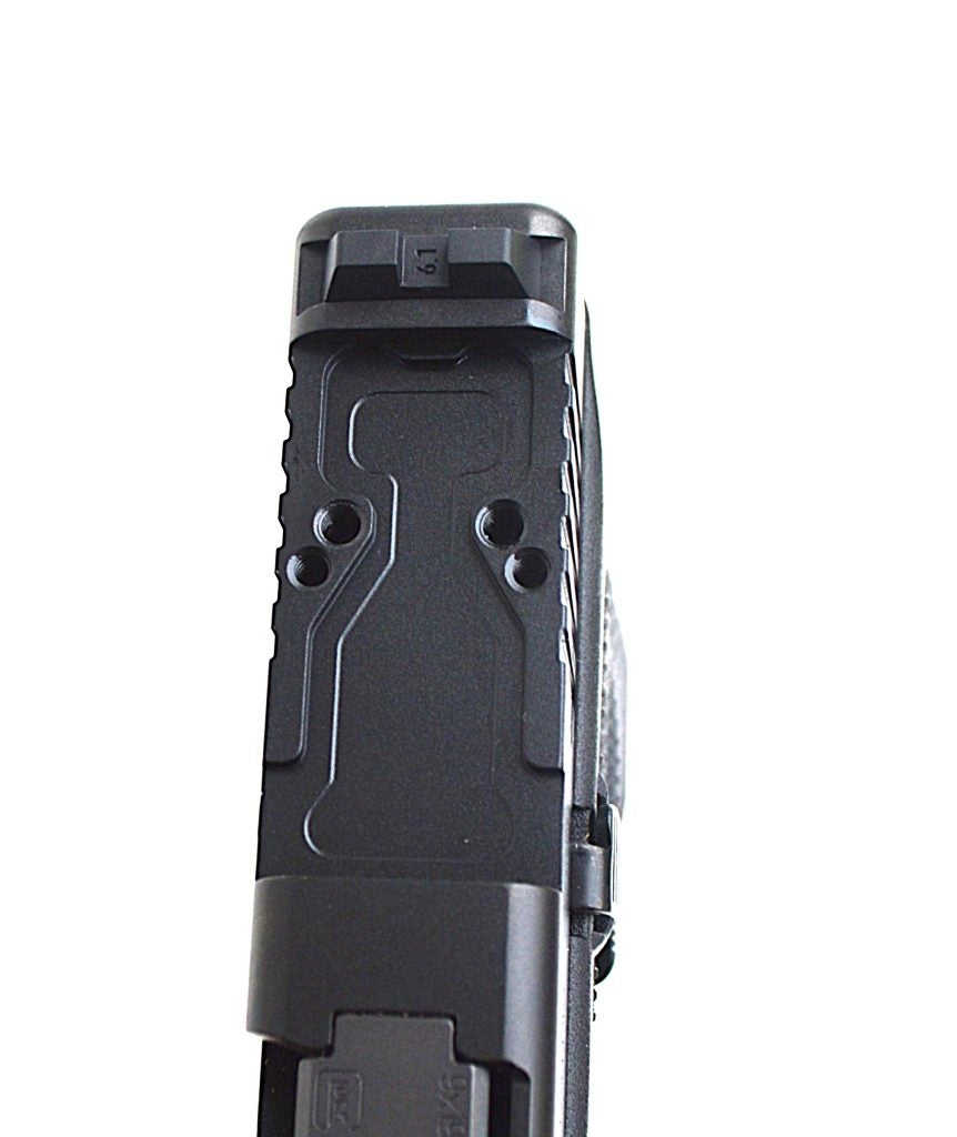 The slide is drilled to accept RMR, DeltaPoint Pro, and C-More footprints. A compression panel is supplied to help align the mounted optic. After initial firing tests, I mounted a Trijicon RMR green dot and fired the pistol extensively in that configuration. It remained secure, and the direct-mount system positions the optic lower in the slide, as Glock intended.