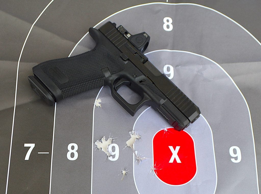 In off-hand fire, the pistol is accurate enough for head shots at 15 yards for most shooters and 25 yards for some of us. The average Glock Generation 5 pistol with its Marksman barrel is capable of 2.5-inch, five-shot groups from a solid benchrest. Some do better, depending on ammunition.