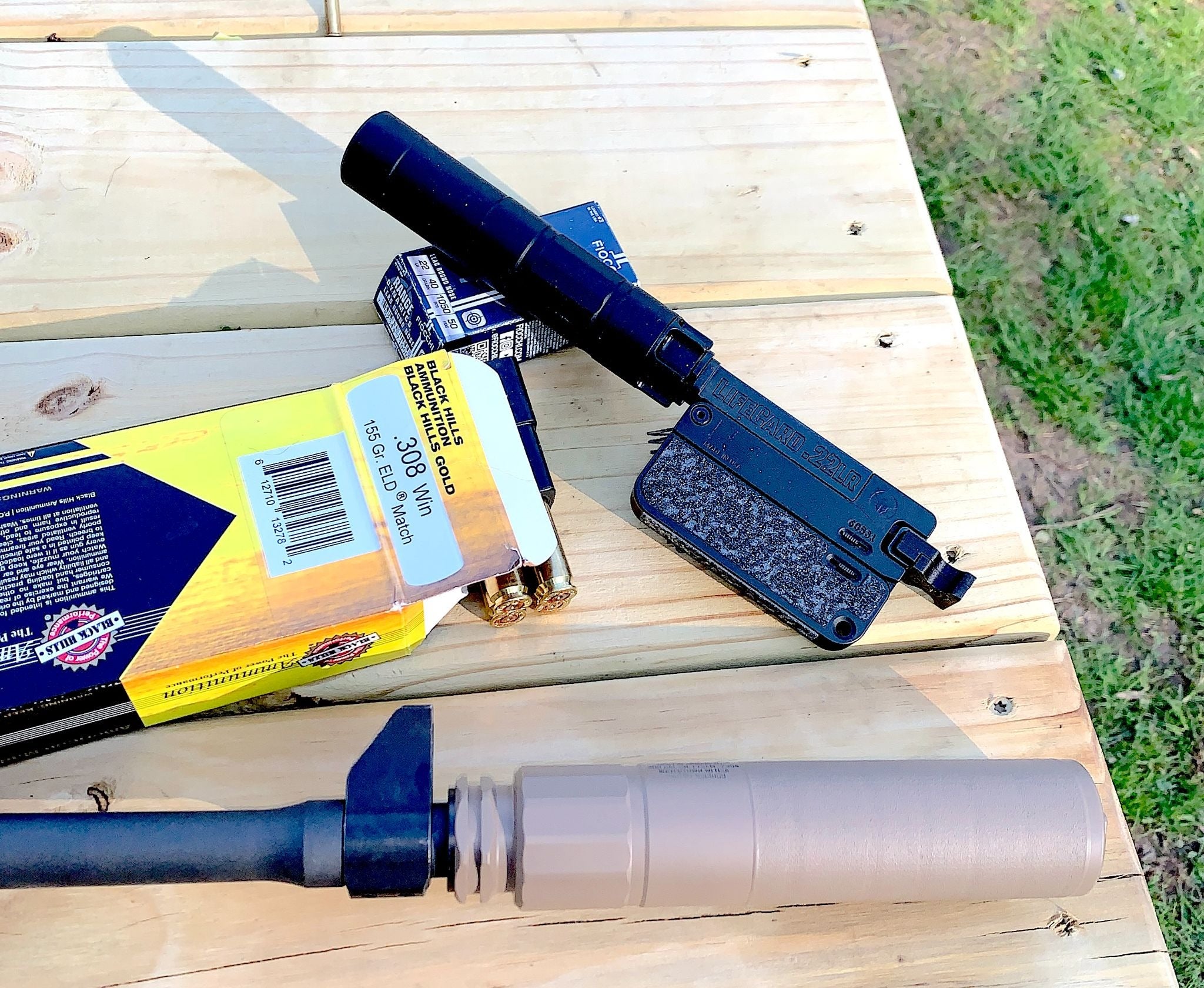 I was sent two suppressors to try… one for a .22 rimfire, and one for a .30-caliber rifle. Here they are: