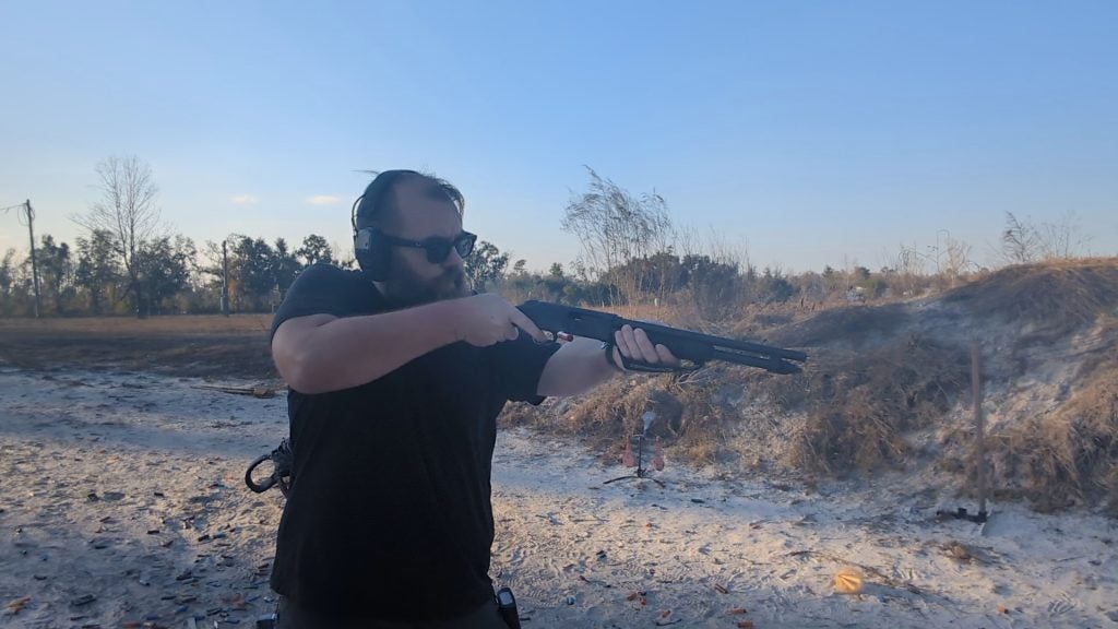 In terms of patterns, it has a cylinder bore, so it’s a bit more dependent on your ammo. At seven yards, you can keep a tight pattern with Federal 00 2.5-inch shells. The Remington Ultimate Defense, a 3-inch 000 load, produced a 4-inch pattern at 7 yards. The Aguila was surprisingly tight, with a 2.5-inch 00 load that patterned the size of my thumb.