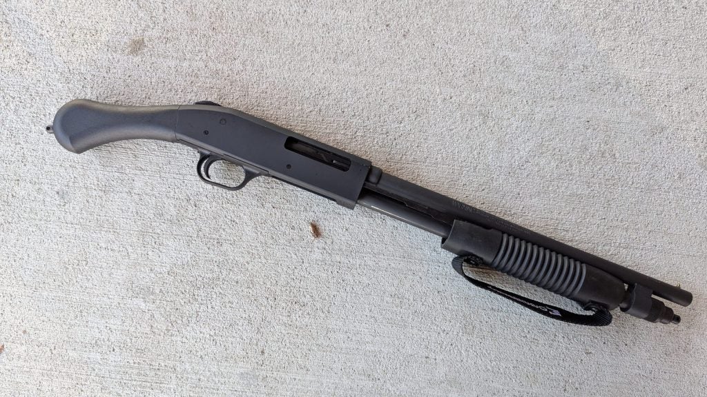 There isn’t much fancy about this gun. It’s a fairly basic 590 model. The gun has a 14-inch heavy-walled barrel and a Raptor grip, with an overall length of 26.37 inches. That “over 26-inch” length ensures it remains an “other firearm” and not an NFA-regulated AOW.