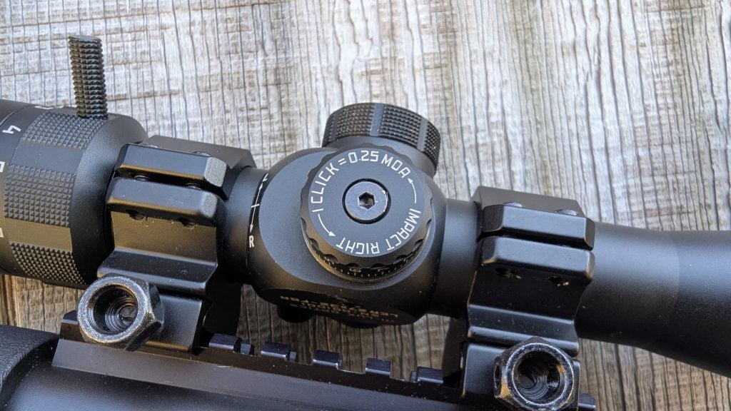 I was nearly dead on. I refined the group ever so slightly and got the zero right where I wanted it with three rounds in a group smaller than an inch. The Mk2 adjustments seem to be dead-on and accurate. The turrets are quite nice and require a concentrated movement to rotate. They won’t accidentally move, and the texture provides the grip you need to click them.