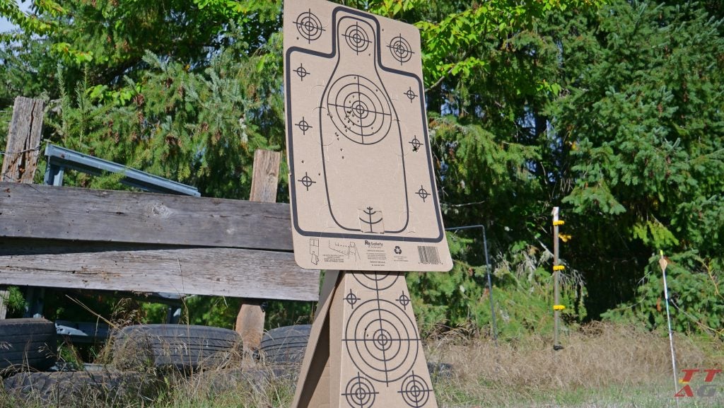 Before I pushed the gun for longer strings, I set up a quick zero session with the Re-Nine Safety Target Cones and their cardboard silhouette targets. The cones and silhouetts are sort of a stand-alone target system that you can use alone or in tandem with one another for quick, impromptu range sessions with quick and easy cleanup. They fold flat for the trip to the range, and the cones fold in seconds and hold the silhouettes rock steady without any wobble as long as you put a small log or stone underneath it.