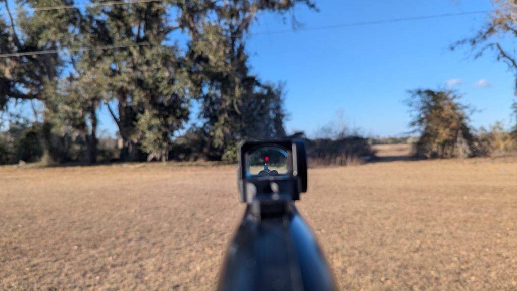 ​No POA/POI issues, no slow-to-align sights; just put the zeroed dot on the target and go. I zeroed this dot to hit about the center of my buckshot’s spread. It creates a great all-around aiming point and lets you go fast.