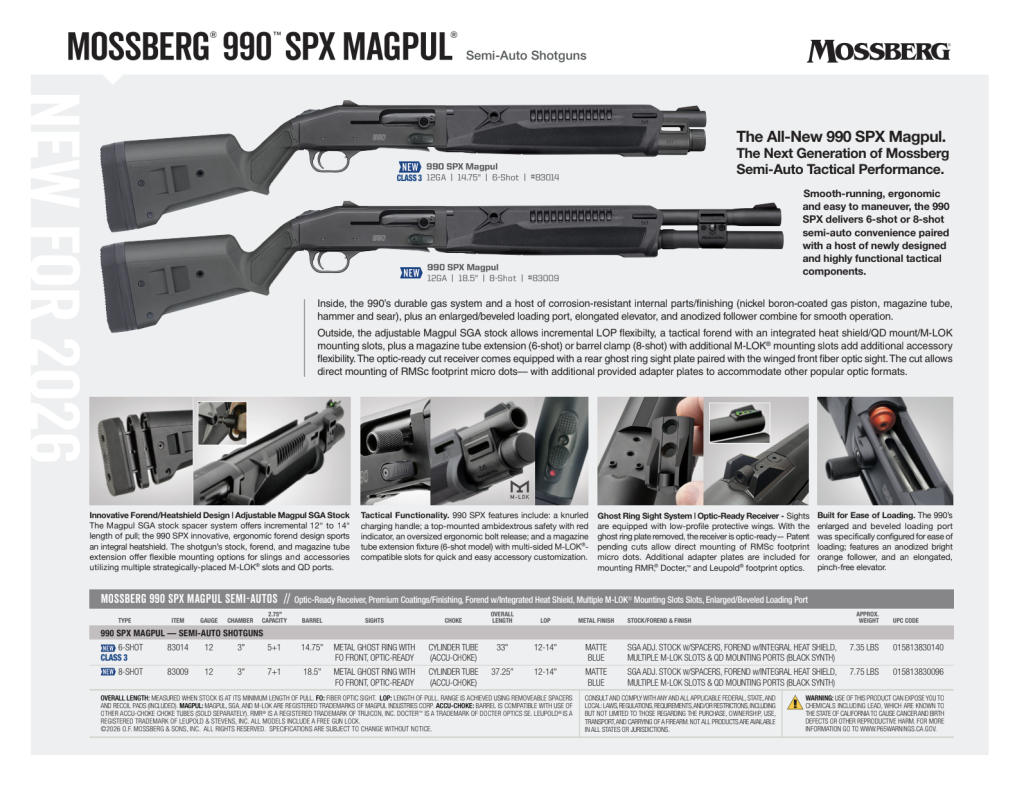 With the 990 SPX Magpul, Mossberg continues to expand its semi-auto shotgun lineup, delivering a modern, feature-driven platform built around reliability, modularity, and practical performance.