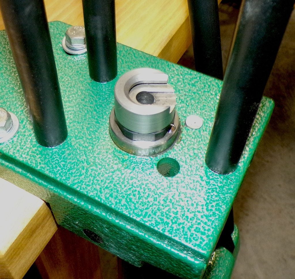 That inch-and-a-half-diameter ram is huge. This case holder doesn’t snap in; it screws down.