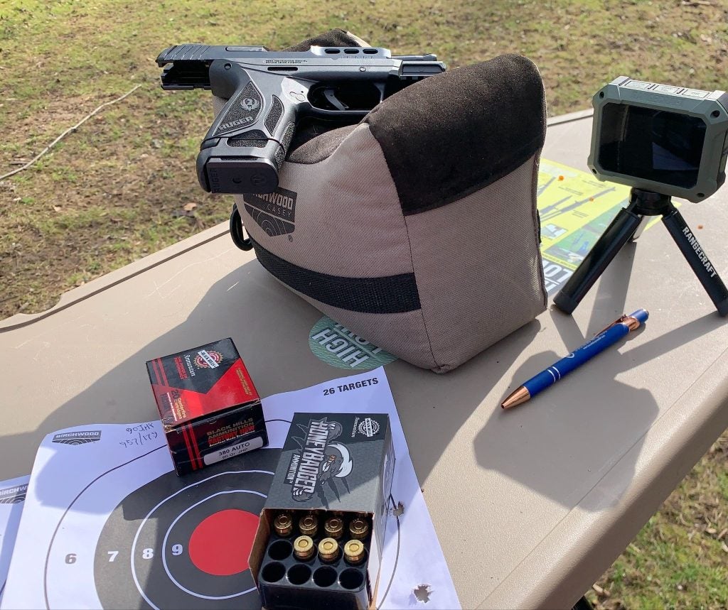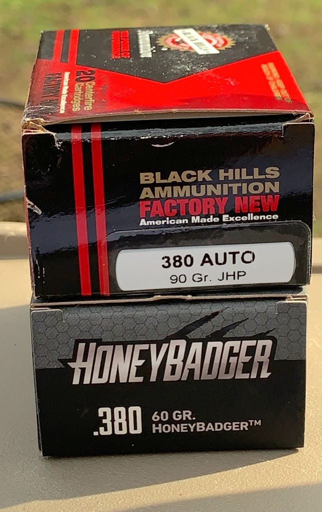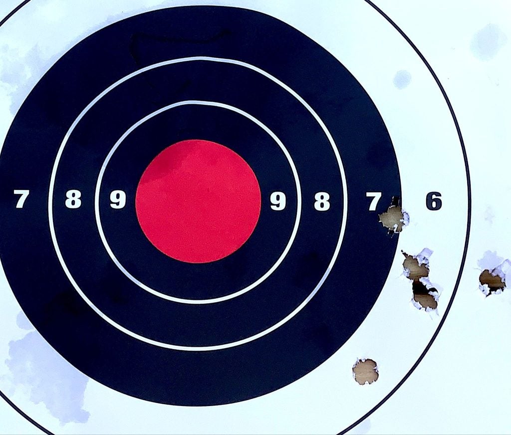 I find that, typically, Black Hills uber-velocity HoneyBadger (no typo) loads to be accurate in whatever caliber I shoot… usually moreso than the “normal” loads. A quick loosening of the rear sight set screw and a bump or two to the left would fix these groups’ center.