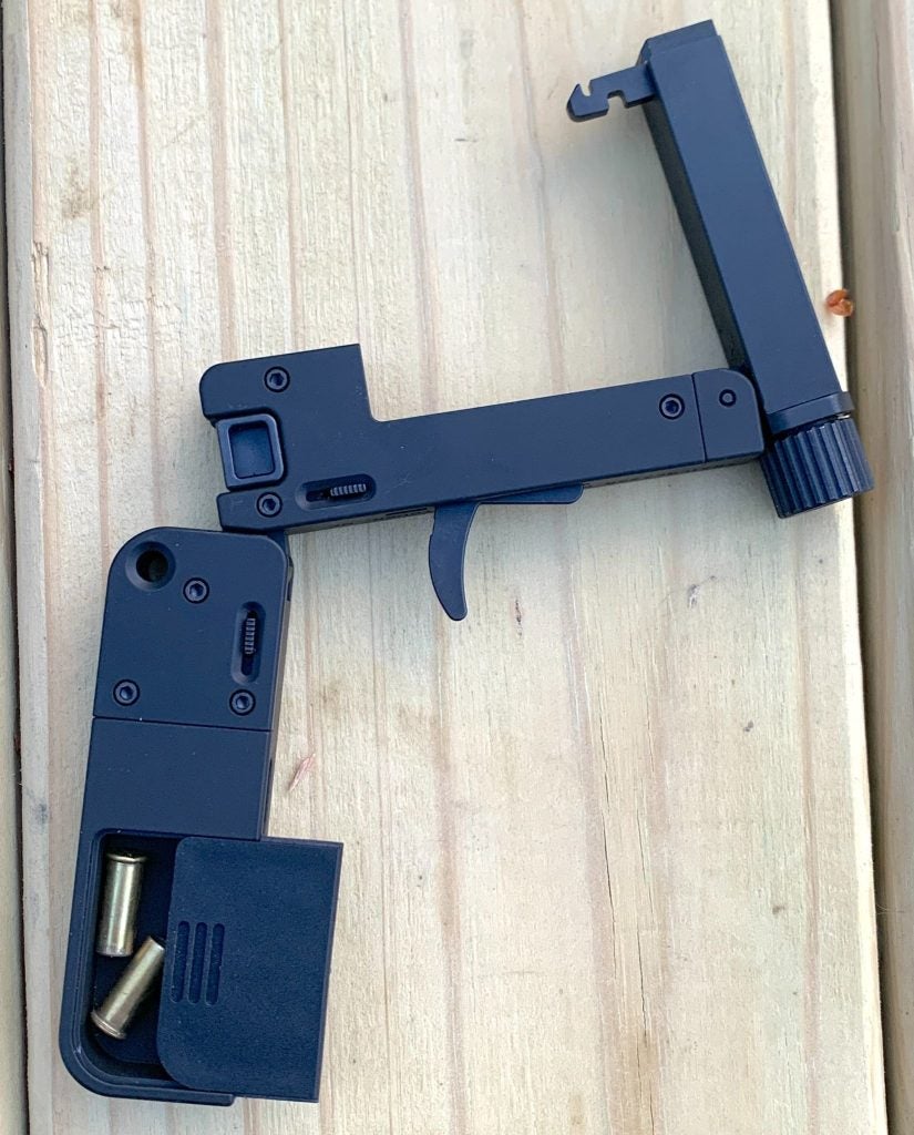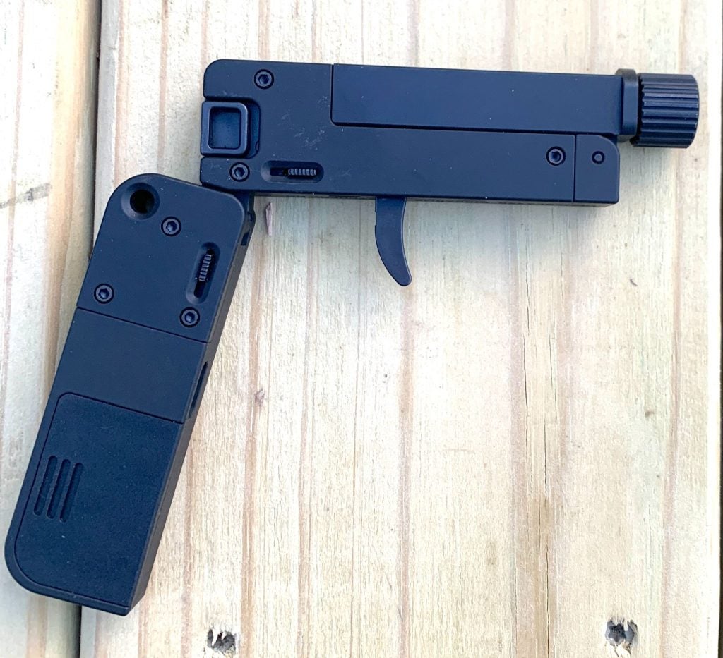 They made a last-ditch, deep-concealment single-shot gun that folds (or unfolds, depending on your timing) from a small aluminum rectangle into a full-size-gripped, threaded-barrel, trigger-fired handgun. It comes in .22 LR, and now also in .22 Magnum. It even has ammo storage in the grip.
