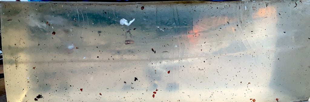 It penetrated over 10 inches… we were impressed! That’s the bullet under the white “squiggle” below. We shot from the right, and the bullet spun around.
