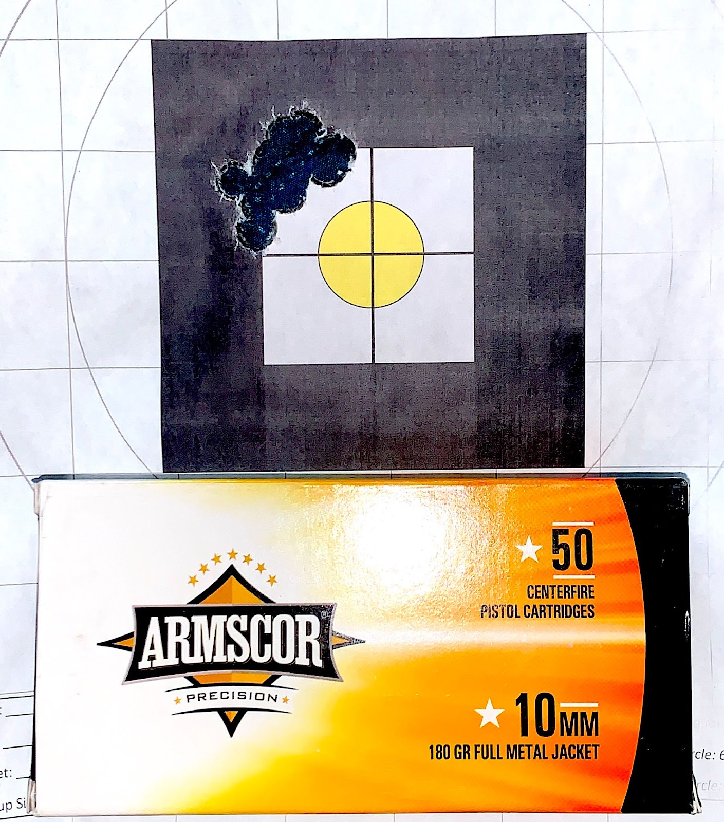 I was very pleased to see the bore sighter dot almost touching the sight’s dot… close enough for jazz! I went back out to my range and set another target up at 25 yards. I brought along a box of Armscor 180-grain FMJ flat-point ammo that I picked up from my local Rural King (they’re amazing, with all the guns and gear they have).