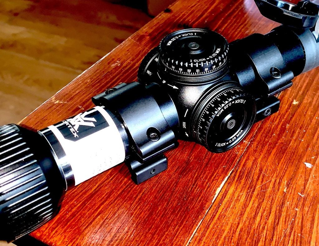 A small thing is the tube diameter. Most of the scopes I’ve reviewed recently use one-inch tubes. This one is 30mm, which lets just a little more light in. That’s a good thing.